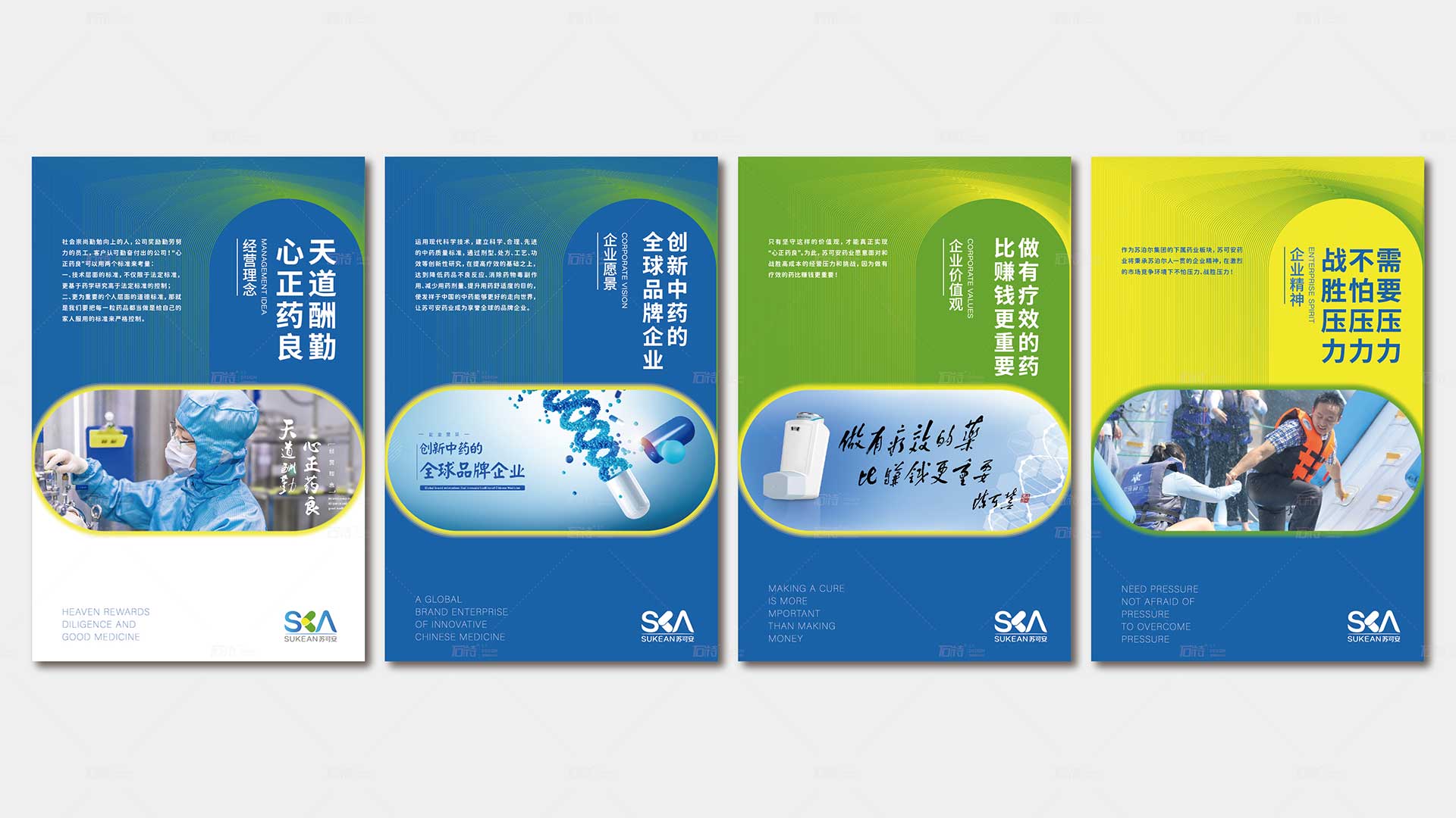 LOGO的中部采用膠囊的組合型來表現K的右半側。上半部分采用顏色變化來區分膠囊兩個部分不同的顏色,根據公司中成藥成分比例進行圖形的融合,下半部分進行斷截處理融入氣霧劑的主體形狀,末端利用漸變處理將氣霧劑的工作狀態進行融入。上下部分組合成一個“心”形,寓意著蘇可安秉持著公益之心,踐行社會責任,做良心之藥。同時代表著公司今后的發展方向和打造心血管領域標桿產品的決心。在表現企業性質的同時,增加了企業的文化感。