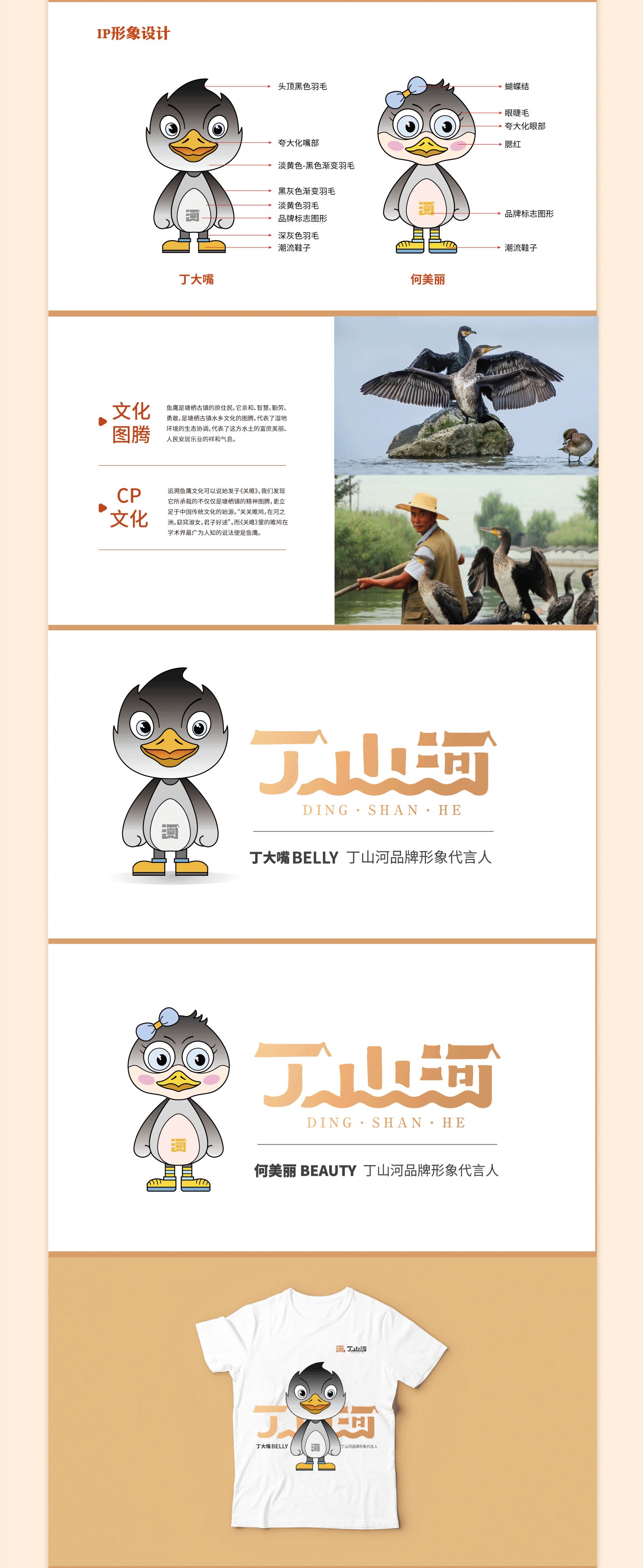 LOGO是消費者認識一個品牌的開端,不僅是品牌視覺傳達要素的核心,也是品牌開展信息傳播的主導力量。結合丁山河的品牌特點,在logo設計時,以“河”為主體,將“丁”“山”二字巧妙融合,組成一個獨特的圖形符號,寓意美好,記憶點明顯;此外,還加入了“廣濟橋”“乾隆御碑”等具有當地特色的符號,展現江南名鎮古韻的特色,地域性鮮明,易于辨認,也有助于將品牌與消費者連接起來,始之成為品牌與受眾的橋梁。同時我們還對其輔助圖形進行了設計,利用原創手繪的形式,將塘棲古鎮的本土建筑、特色進行呈現,展現地方原貌,突出當地特色,進而拉近與消費者的距離,幫助消費者更好的了解品牌。另外,我們還對丁山河的IP進行打造,獲得客戶的認可。