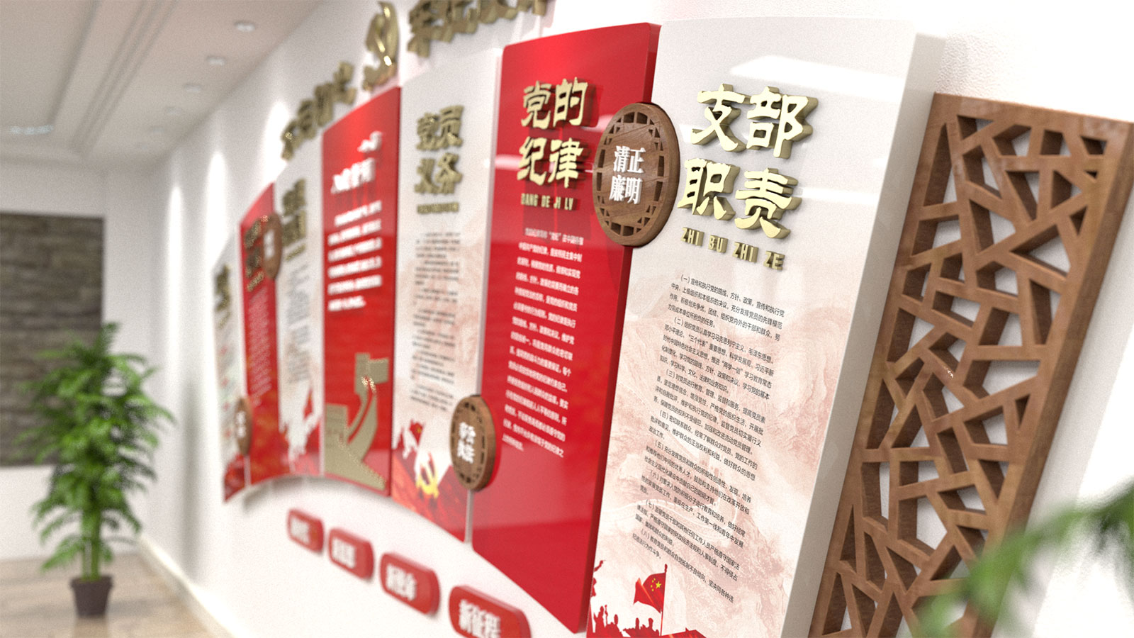 黨建文化墻可將黨史、黨建、廉政、活動等板塊與黨建文化系列之應用場景進行巧妙設計之后,變成融合一體的系列文化宣傳工具。