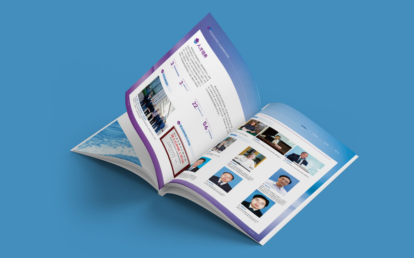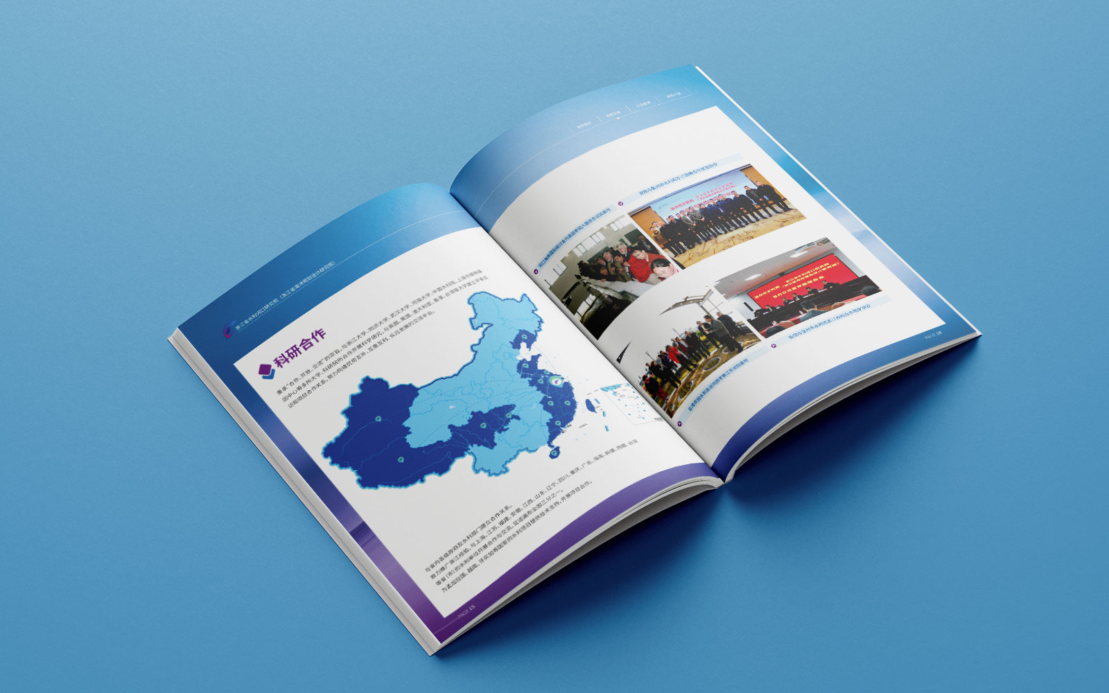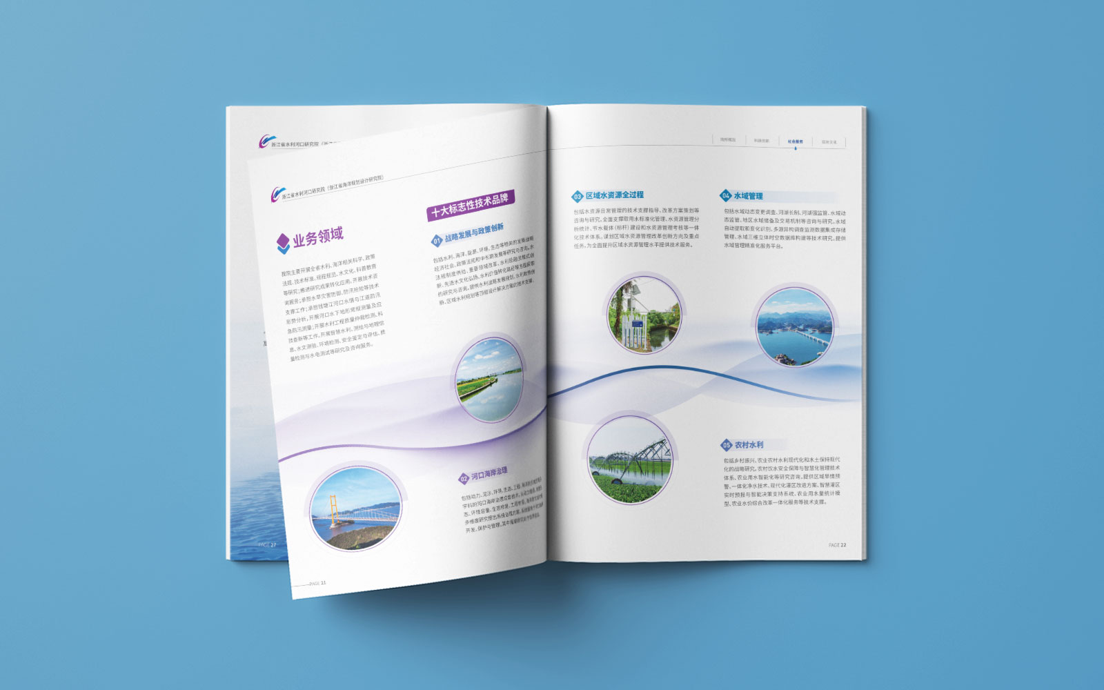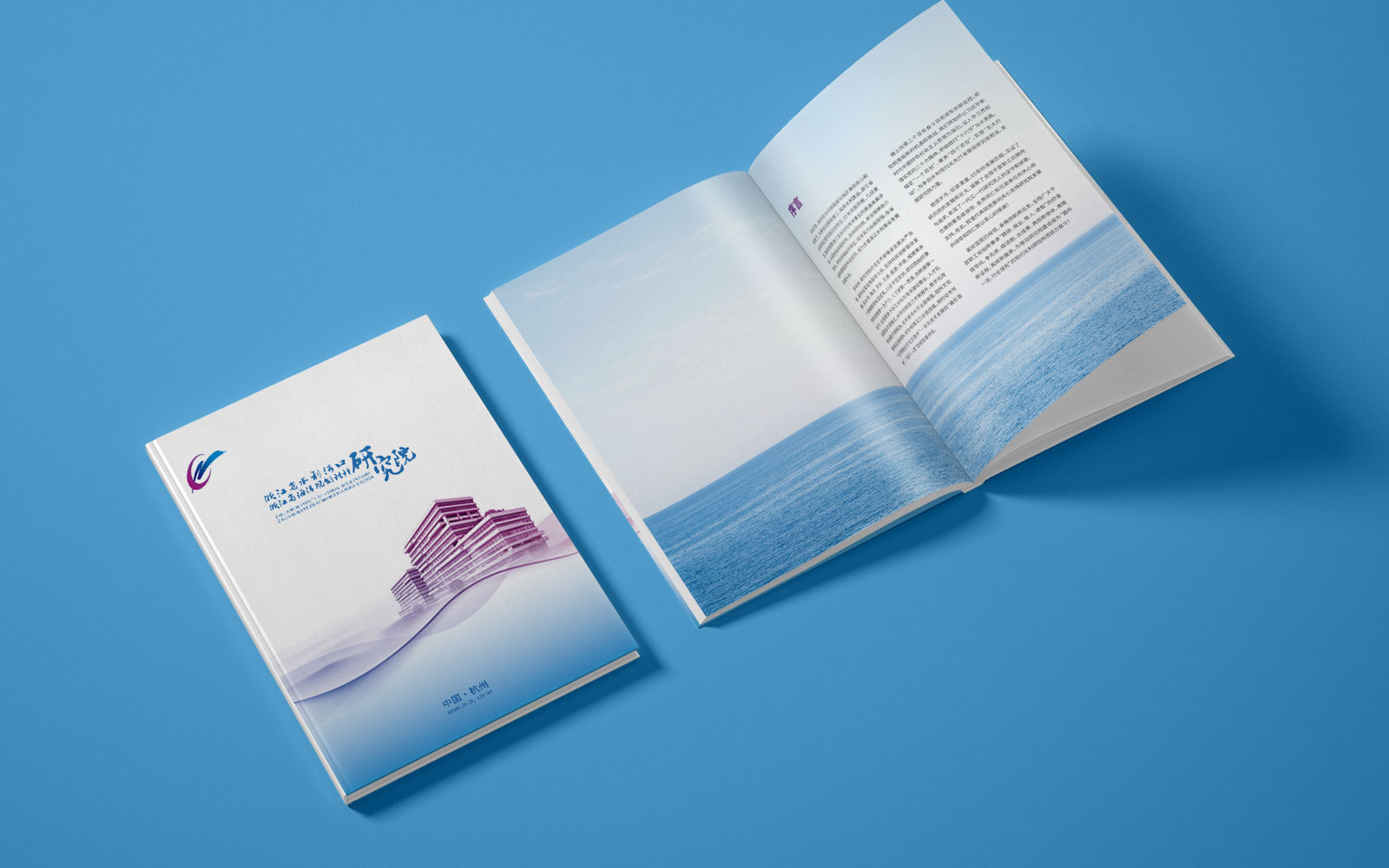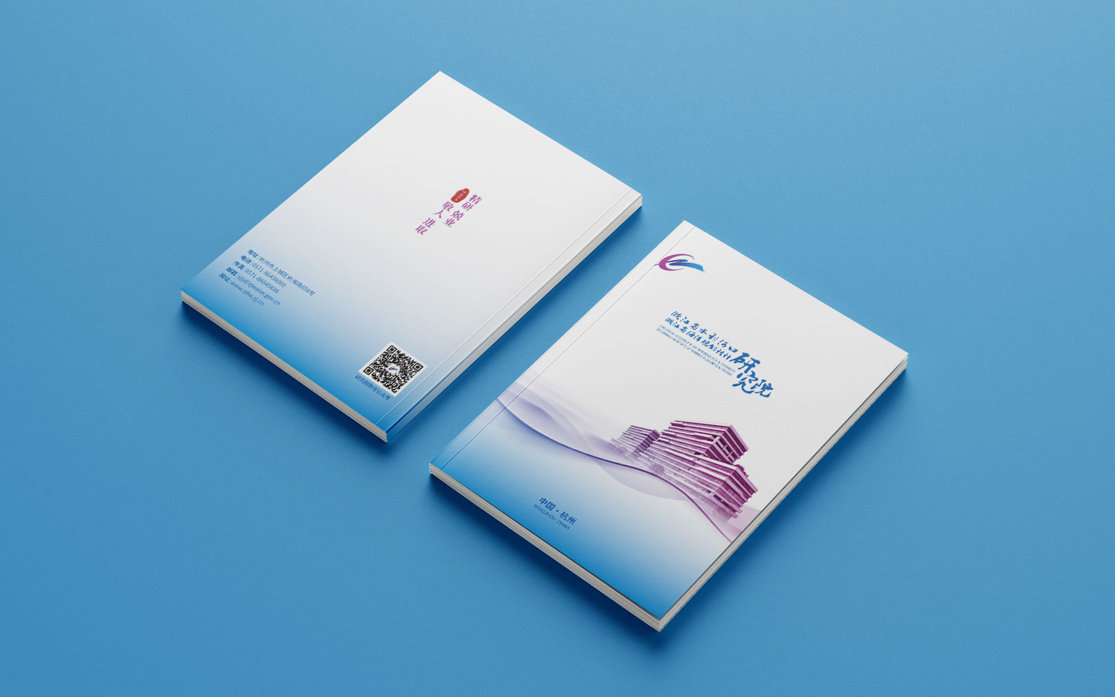 1、石特開始設計宣傳冊的封面,我們選用研究院標志性建筑作為背景,突出了該機構在浙江省水利事業中的地位和影響力,同時,在封底上加入了幾個簡潔明了的關鍵詞——精研,兢業、敬人、進取等,以引起讀者對該機構工作內容和價值觀念的關注。