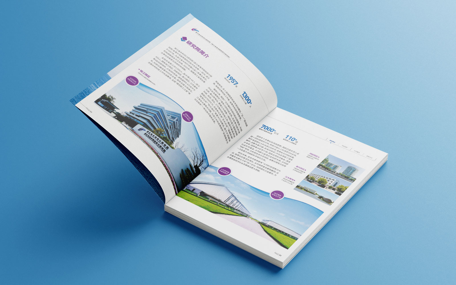 2、石特設計宣傳冊內頁時,采用了簡潔明了、圖文并茂的方式來展示研究院的發展歷程、業務領域、科研合作等相關信息,其中大量使用圖片、數據來呈現相關信息,并配以簡單易懂、通俗易懂的文字說明,便于用戶理解。