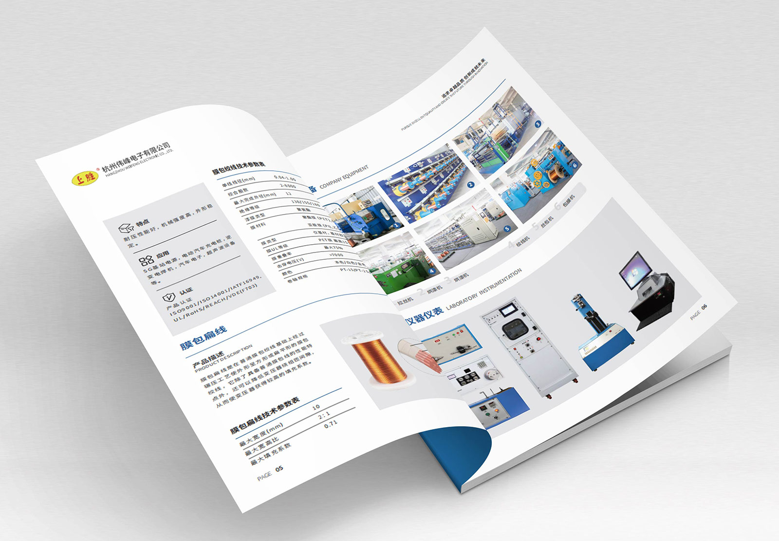 杭州偉峰電子有限公司是一家有近30年歷史的高端銅繞組線專業生產企業,主要生產漆包絞合線、絲包漆包絞合線、膜包漆包絞合線三個系列、共40多個品種的繞組線,公司產品廣泛應用于高頻電感、無線充電等多個領域,客戶遍及中國、韓國、日本、澳大利亞、俄羅斯等十幾個國家,年產繞組線超過3000噸。為能更好的展示企業實力及品牌形象,偉峰電子希望通過宣傳冊為對外宣傳的一個重要窗口,因此找到石特。