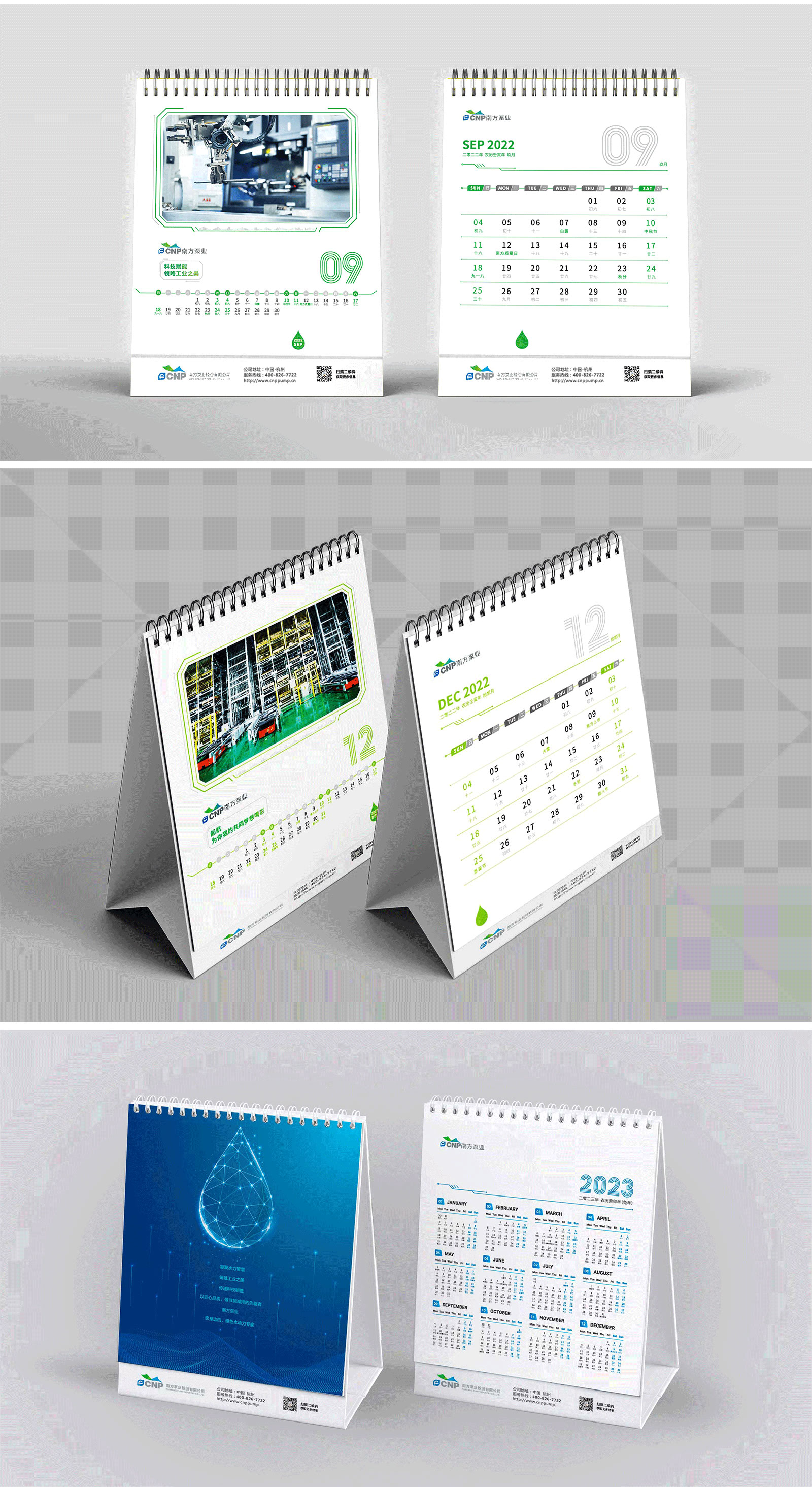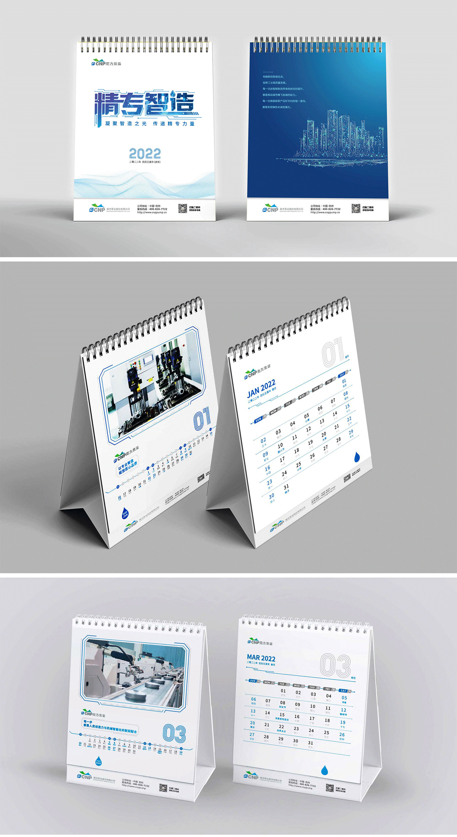 為能更好的突出南方泵業(yè)的企業(yè)文化及品牌調性,在風格選擇上,石特采取簡約的設計風格,在顏色選擇上,我們考慮到企業(yè)屬性,采用以藍色為基本調,彰顯時尚感與科技感。日歷的封面以“精專智造”四個字為主,突出企業(yè)的核心優(yōu)勢,封面字體作了精心設計,視覺呈現上更為直觀、大氣;在日歷內頁上,為能保持實用性與美觀性并存,采取圖文結合的形式進行設計,圖片以南方泵業(yè)的產品圖為主,底部標注月份、日期,其重點突出,層次明晰,一目了然。