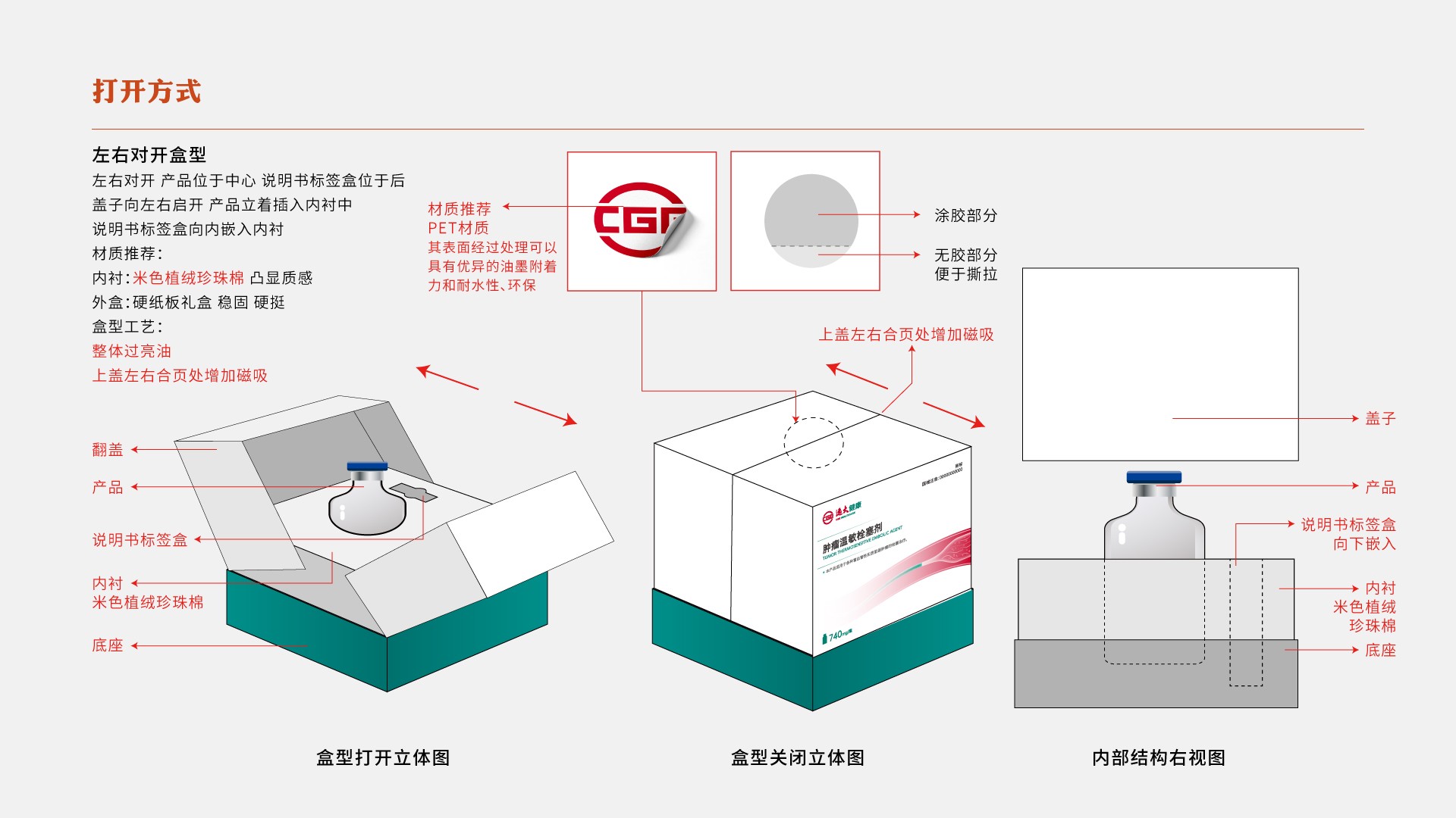 腫瘤溫敏栓塞劑作用于肝癌腫瘤患者,該醫(yī)療器械需取放便捷,我們采用雙開門的開口方式,開口處有磁吸與標(biāo)貼,雙重防護(hù),標(biāo)貼并非全覆蓋粘貼,有涂膠與非涂膠部分,在保證產(chǎn)品安全的同時(shí)不失便捷。