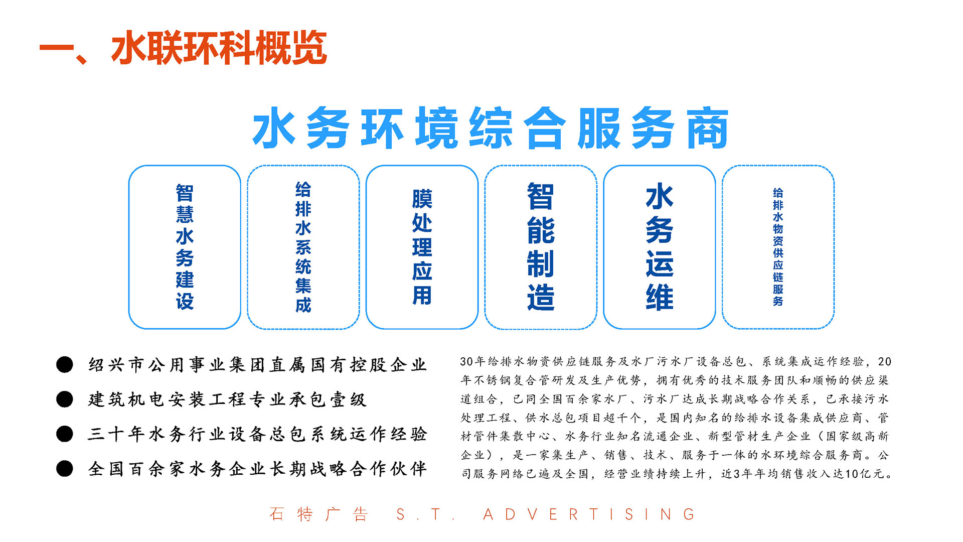 浙江水聯環科集團有限公司作為紹興市公用事業集團直屬的國有控股企業,深耕供排水物資經營、不銹鋼復合管生產及設備集成總包領域20余年,銷售網絡覆蓋省內外,近3年年均銷售收入達6.5億元,并獲評浙江省守合同重信用3A級單位、國家高新技術企業等榮譽。面對行業競爭加劇與可持續發展需求,石特廣告策劃團隊以“科技賦能水務,綠色驅動未來”為核心理念,為其量身定制品牌全案升級方案,涵蓋調研分析、品牌定位、品牌DNA重構、廣告語提煉、VI視覺識別系統設計及宣傳畫冊策劃,助力企業從傳統制造向科技化、綠色化品牌轉型,強化行業標桿地位。