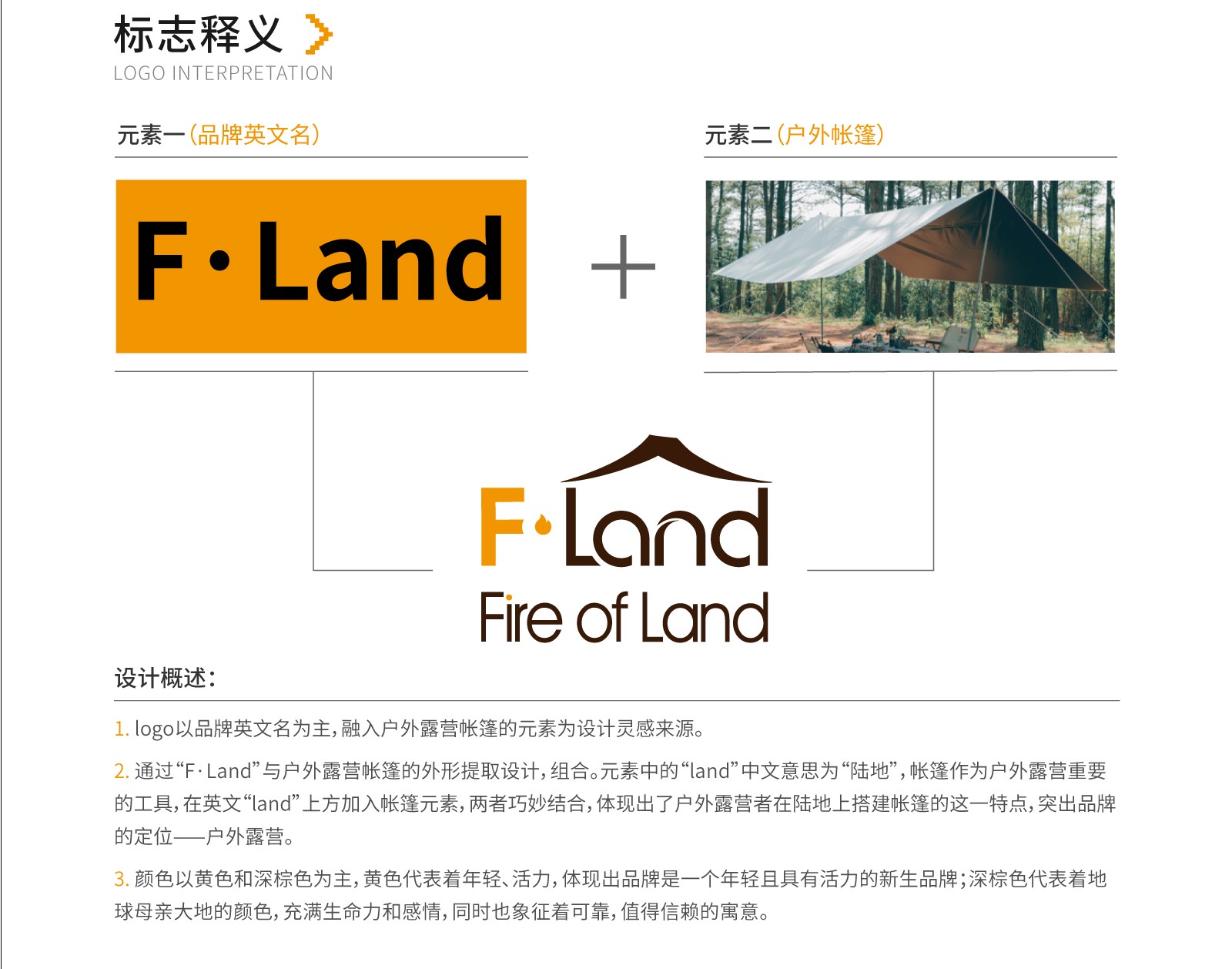 通過(guò)“F.Land"與戶外露營(yíng)帳篷的外形提取設(shè)計(jì),組合。元素中的“l(fā)and"中文意思為“陸地”,帳篷作為戶外露營(yíng)重要的工具,在英文“l(fā)and"上方加入帳篷元素,兩者巧妙結(jié)合,體現(xiàn)出了戶外露營(yíng)者在陸地上搭建帳篷的這一特點(diǎn),突出品牌的定位一戶外露營(yíng)。