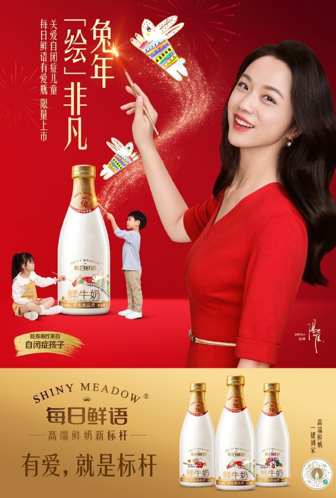 每日鮮語的議題很明顯——選擇公益行動,在這場自閉癥孩童關愛行動中,每日鮮語將產品、創意融入其中,向公眾推出“兔年有愛瓶”,有愛的不僅是瓶身的畫作創意、還有展現出來的品牌的價值觀,“積極有愛”的形象與每日鮮語綁定。