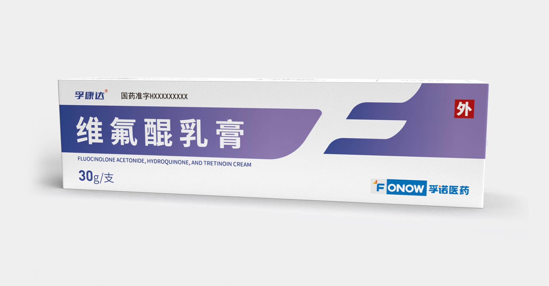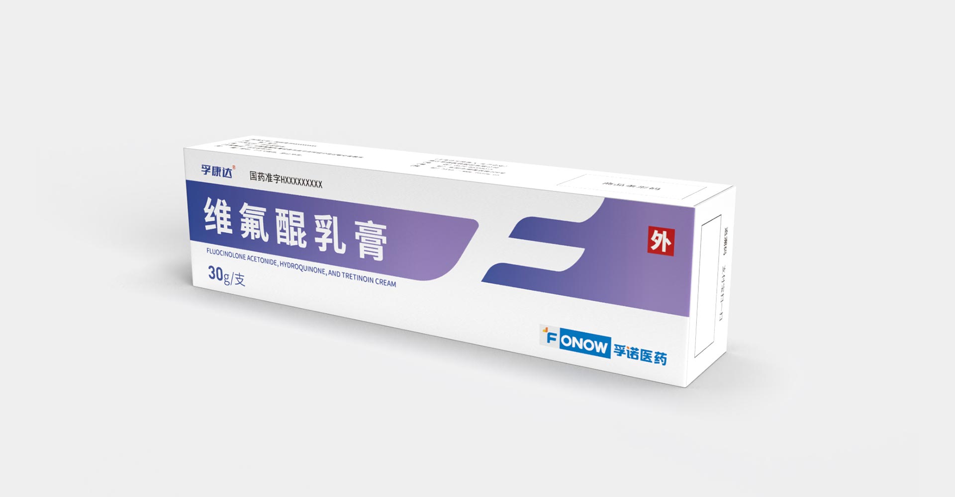 孚諾醫藥兩批次委托石特大健康進行產品包裝設計,首次設計產品上市滿意后進行了二次新款的設計;為維氟醌乳膏設計包裝:“孚康達”的首字母“F”進行創意設計,紫色、白色色塊勾勒“F”字形,增強品牌識別,紫色寓意優雅、高貴,以其為主色與產品主要治療功效變美的預期目標相符合。同款產品兩個渠道不同設計方案。