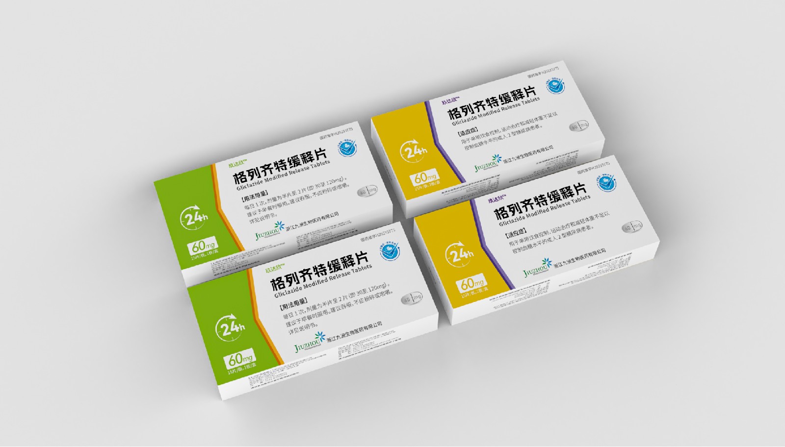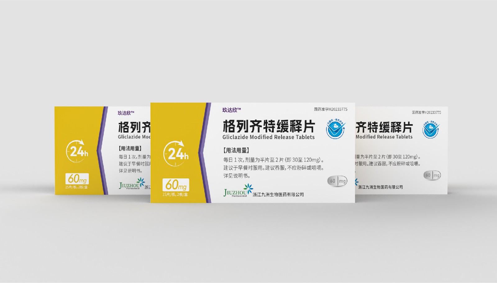 設(shè)計方案中藥效持續(xù)時間作為視覺符號出現(xiàn),起到強調(diào)藥突出作用。強調(diào)用法用量與藥效持續(xù)時間數(shù)字“1”、“24”做傾斜處理體現(xiàn)速度感,在起到突出強調(diào)的同時,也體現(xiàn)藥片控制血糖速度之感。企業(yè)標志和企業(yè)名稱結(jié)合使用突出企業(yè)形象。藥片設(shè)計突出單片藥劑量和藥片可掰片使用。