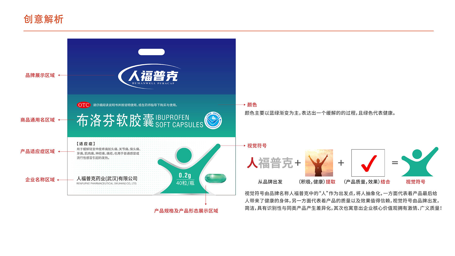 “人福普克”我們?nèi)〕觥叭恕弊郑⒁苑?wù)的“人”為出發(fā)點。樂觀積極,健康向上是正能量精神,賦予此層含義,符號整體形式帶給人們一種正能量的情緒感染。對鉤標(biāo)識喻義健康的身體,結(jié)合產(chǎn)品屬性,又喻產(chǎn)品有著值得信賴的品質(zhì)和效果。由品牌出發(fā)進(jìn)行設(shè)計,簡潔的視覺符號內(nèi)含豐富寓意,與同類產(chǎn)品產(chǎn)生差異化,并映射出企業(yè)激情且具有廣義質(zhì)量的核心價值觀。