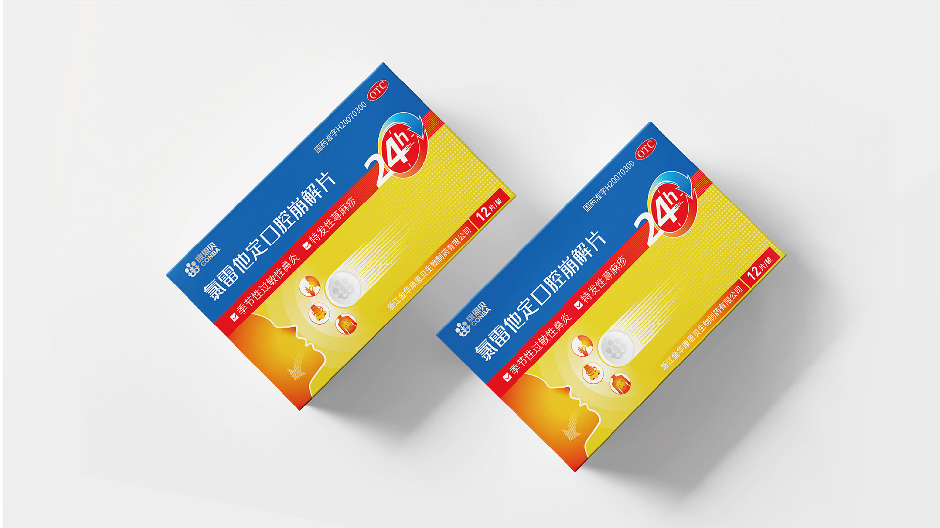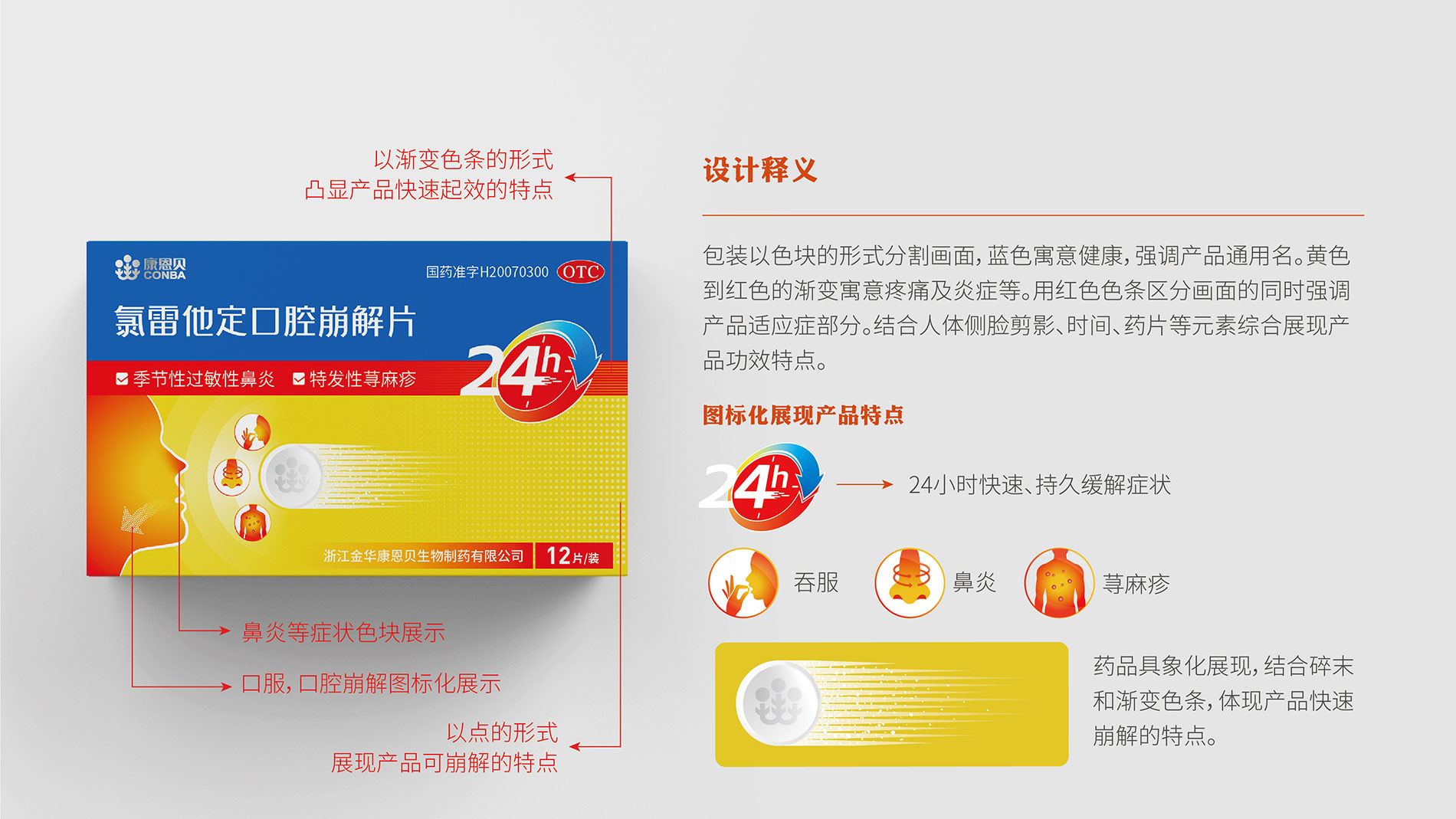 包裝以色塊的形式分割畫面,藍色寓意健康,強調(diào)產(chǎn)品通用名。黃色到紅色的漸變寓意疼痛及炎癥等。用紅色色條區(qū)分畫面的同時強調(diào)產(chǎn)品適應(yīng)癥部分。結(jié)合人體側(cè)臉剪影、時間、藥片等元素綜合展現(xiàn)產(chǎn)品功效特點。