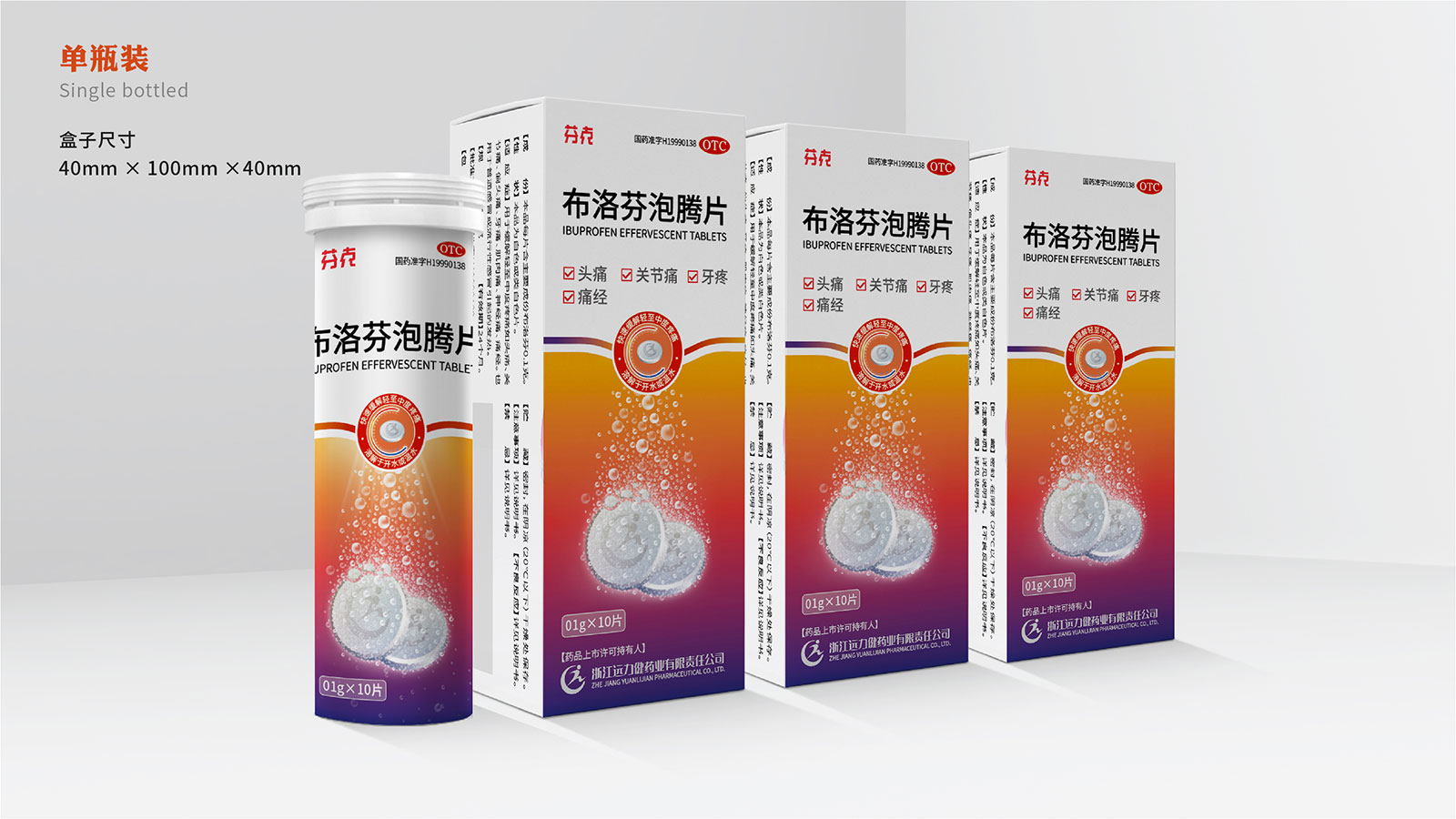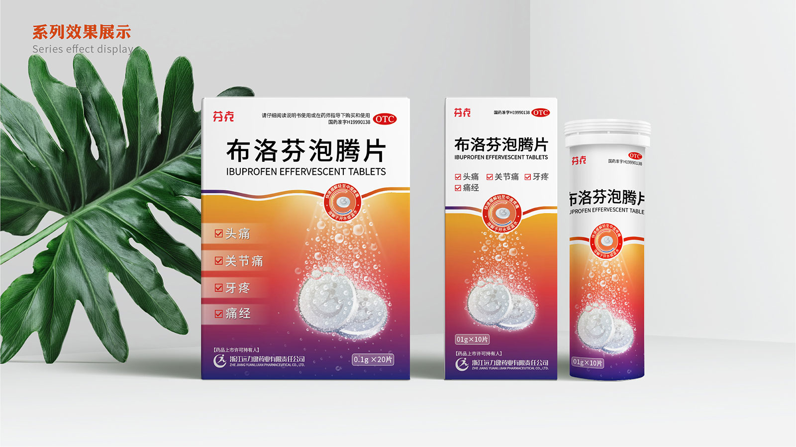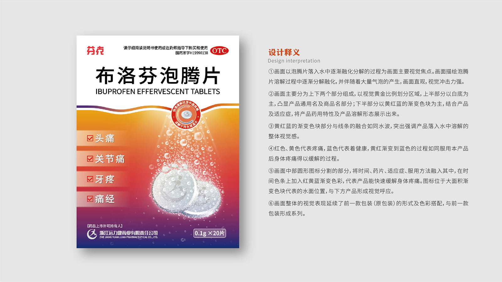 ③黃紅藍的漸變色塊部分與線條的融合如同水波,突出強調產品落入水中溶解的整體視覺感。④紅色、黃色代表疼痛,藍色代表著健康,黃紅漸變到藍色的過程如同服用本產品后身體疼痛得以緩解的過程。⑤畫面中部圓形圖標分割的部分,將時間、藥片、適應癥、服用方法融入其中,在時間色條上加入紅黃藍漸變色彩,代表產品能快速緩解身體疼痛。圖標位于大面積漸變色塊代表的水面位置,與下方產品形成視覺呼應。⑥畫面整體的視覺表現延續了前一款包裝(原包裝)的形式及色彩搭配,與前一款包裝形成系列。