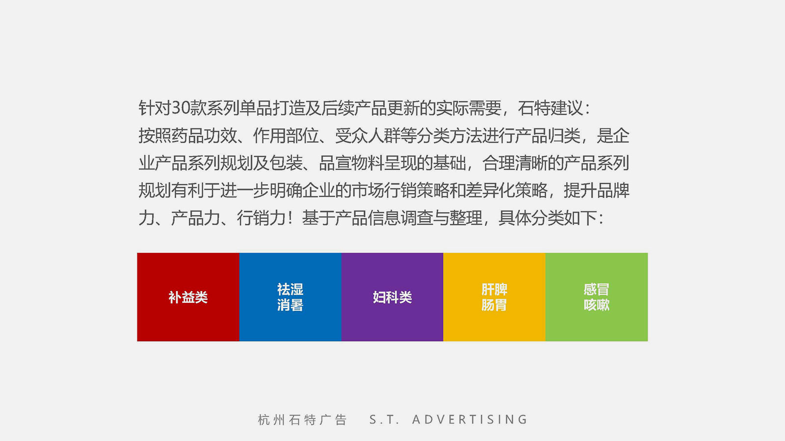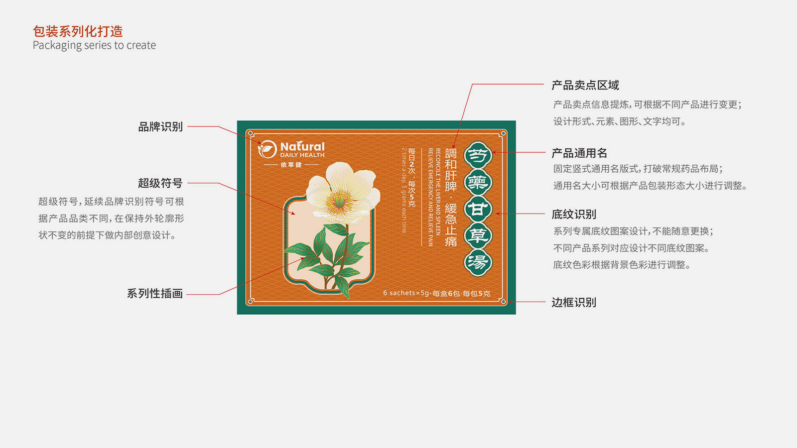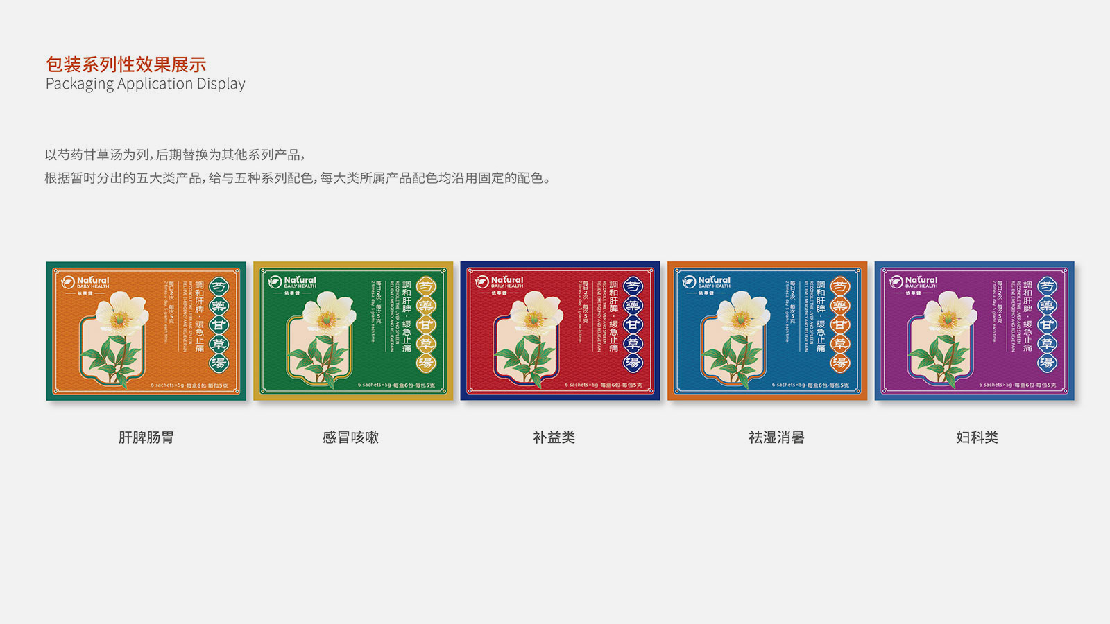 各大系列在企業(yè)品牌統(tǒng)一視覺基調(diào)上進行設計,強化品牌識別度。根據(jù)藥品主治功效、作用部位、受眾人群,基于藥品屬性和人視覺、心理需求,通過醒目悅目的色彩和輔助圖形創(chuàng)意,對藥品分門別類,提高系列識別與單品辨識度。達到科學美觀、清晰易辨的效果。