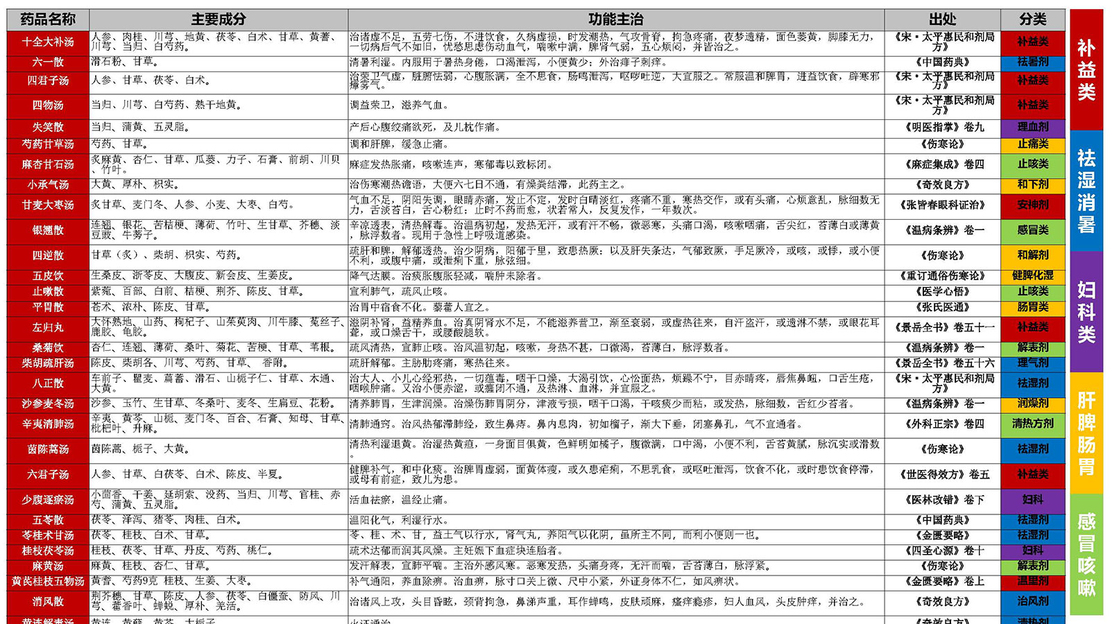 十全大補湯,六一散,四君子湯,四物湯,失笑散,芍藥甘草湯,麻杏甘石湯,小承氣湯,甘麥大棗湯,銀翹散,四逆散,五皮飲,止嗽散,平胃散,左歸丸,桑菊飲,柴胡疏肝湯,八正散,沙參麥冬湯,辛夷清肺湯,茵陳蒿湯,六君子湯,少腹逐瘀湯,五苓散,苓桂術甘湯,桂枝茯苓湯,麻黃湯,黃芪桂枝五物湯,消風散,黃連解毒湯包裝設計