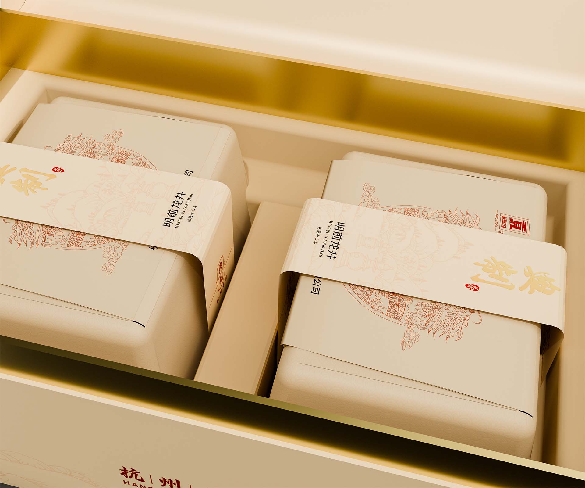 本款“典制系列西湖龍井茶明前龍井禮盒包裝”設計案例,旨在通過精致、傳統的包裝形式,展現西湖龍井茶的獨特韻味與高端品質。設計靈感來源于中國傳統茶文化,結合現代審美趨勢,力求打造一款既符合傳統審美又具現代感的禮盒包裝。