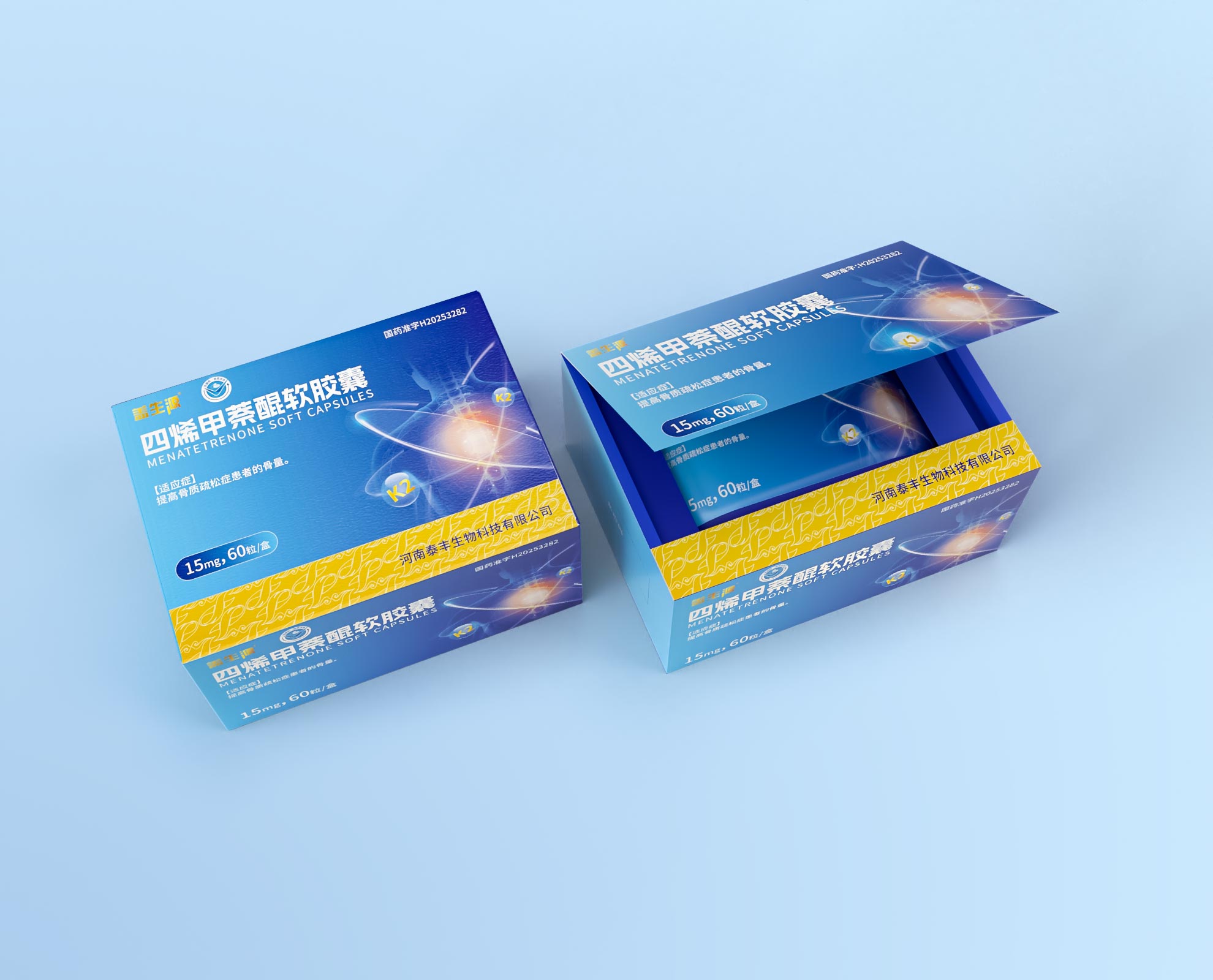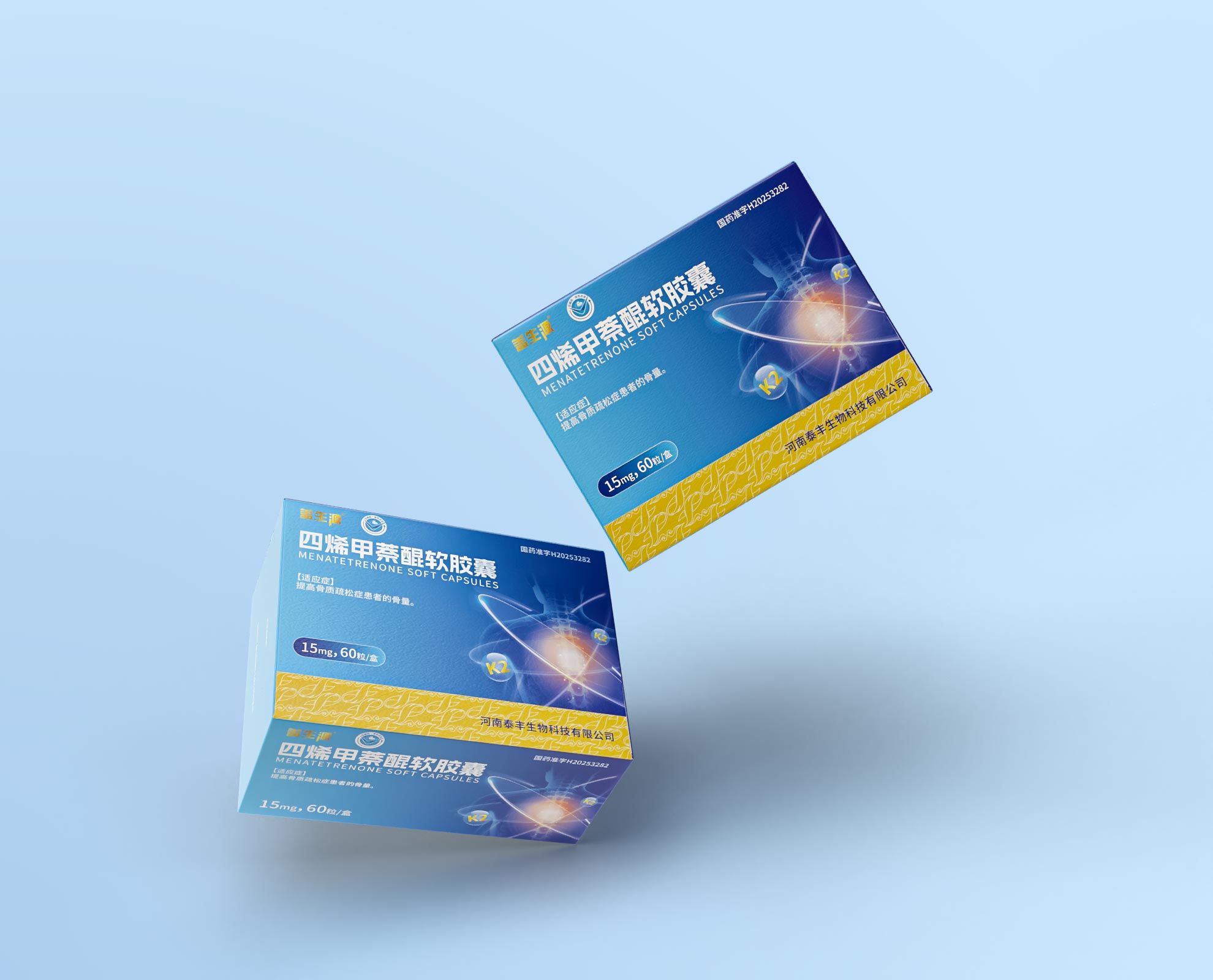 四烯甲萘醌軟膠囊作為專注骨骼健康的醫藥產品,在臨床及消費市場需求持續增長。其包裝需精準傳遞 “助力骨骼健康” 的產品價值,同時展現泰豐生物的品牌實力,在滿足醫藥產品合規性、穩定性要求基礎上,通過視覺設計強化產品辨識度與專業感,適配醫藥流通、終端消費等多場景,為醫患溝通、消費者選購提供優質視覺體驗 。