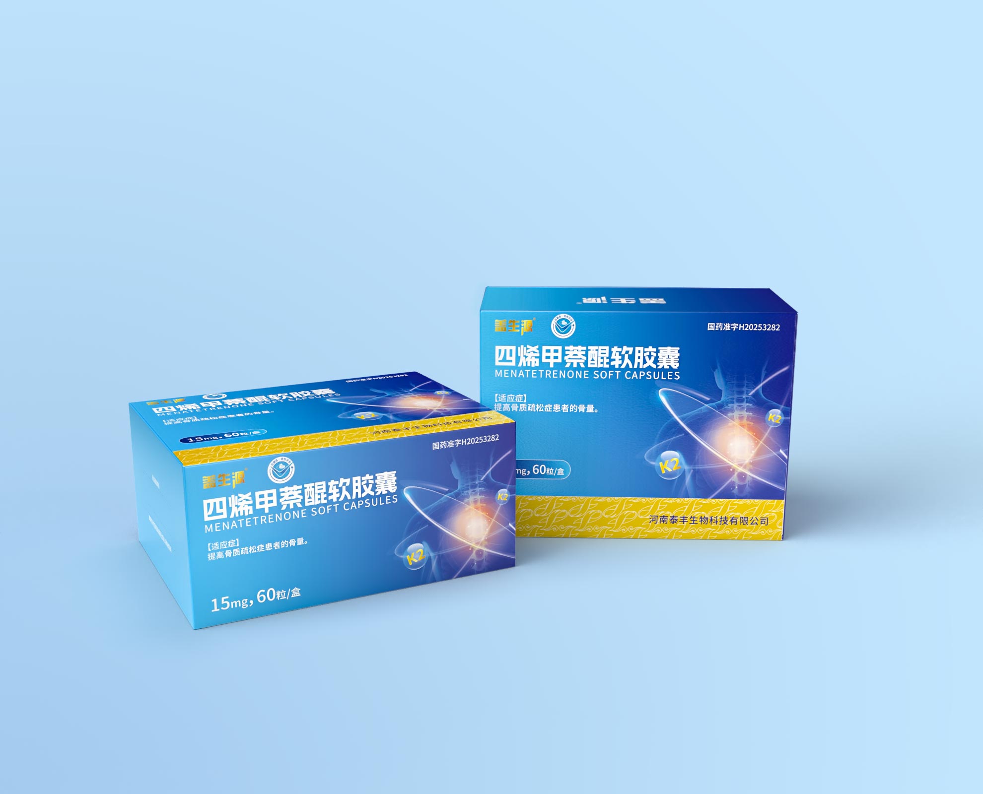 信息規范:嚴格遵循醫藥包裝法規,清晰展示 “國藥準字 H20253282” 等批準文號、“河南泰豐生物科技有限公司” 生產信息,確保合規性;同時優化排版,讓產品名稱 “四烯甲萘醌軟膠囊(MENATETRENONE SOFT CAPSULES)” 、適應癥等關鍵內容醒目呈現,助力專業人士及消費者快速獲取信息。