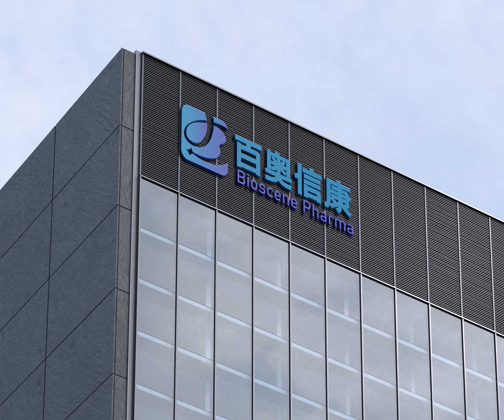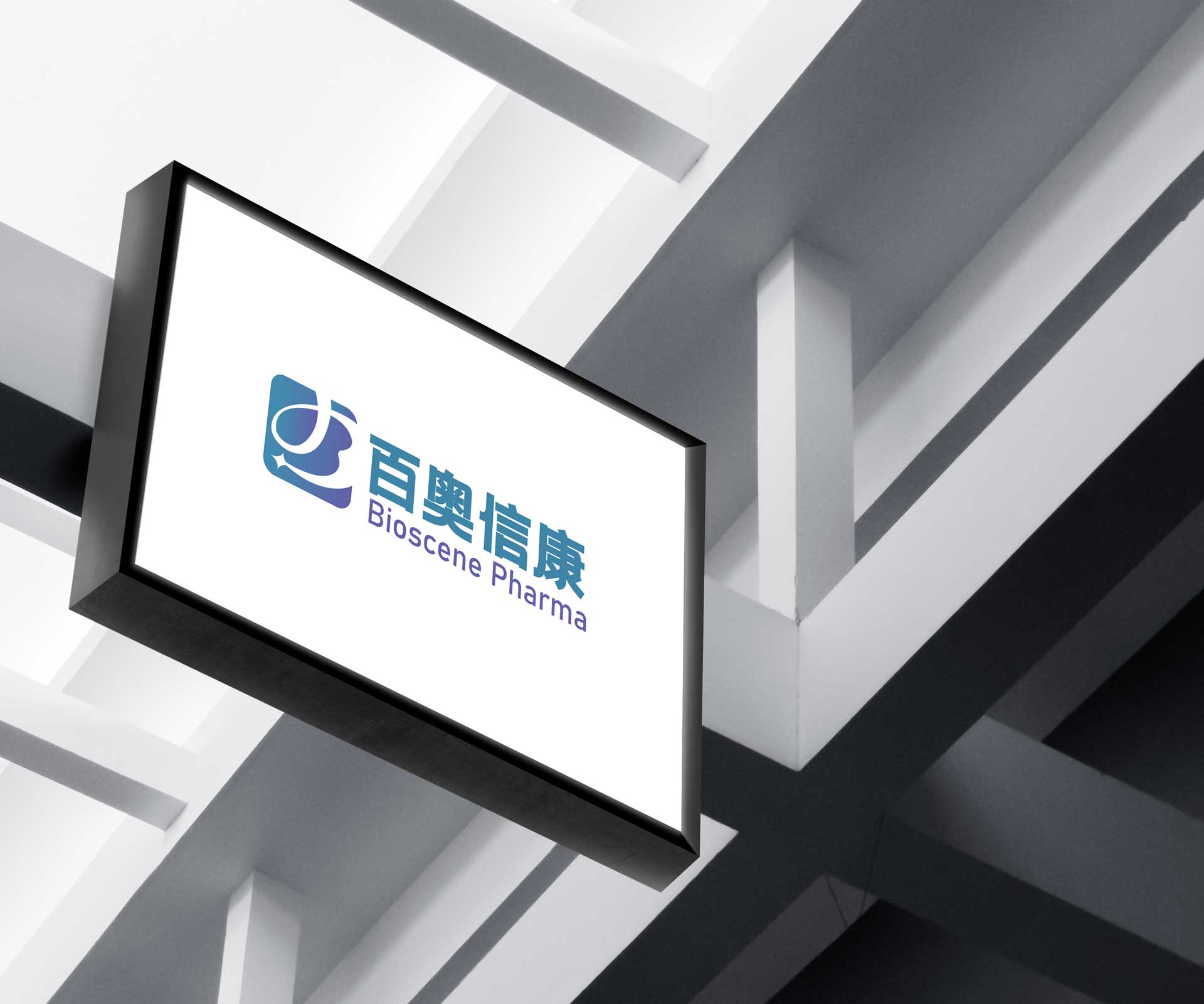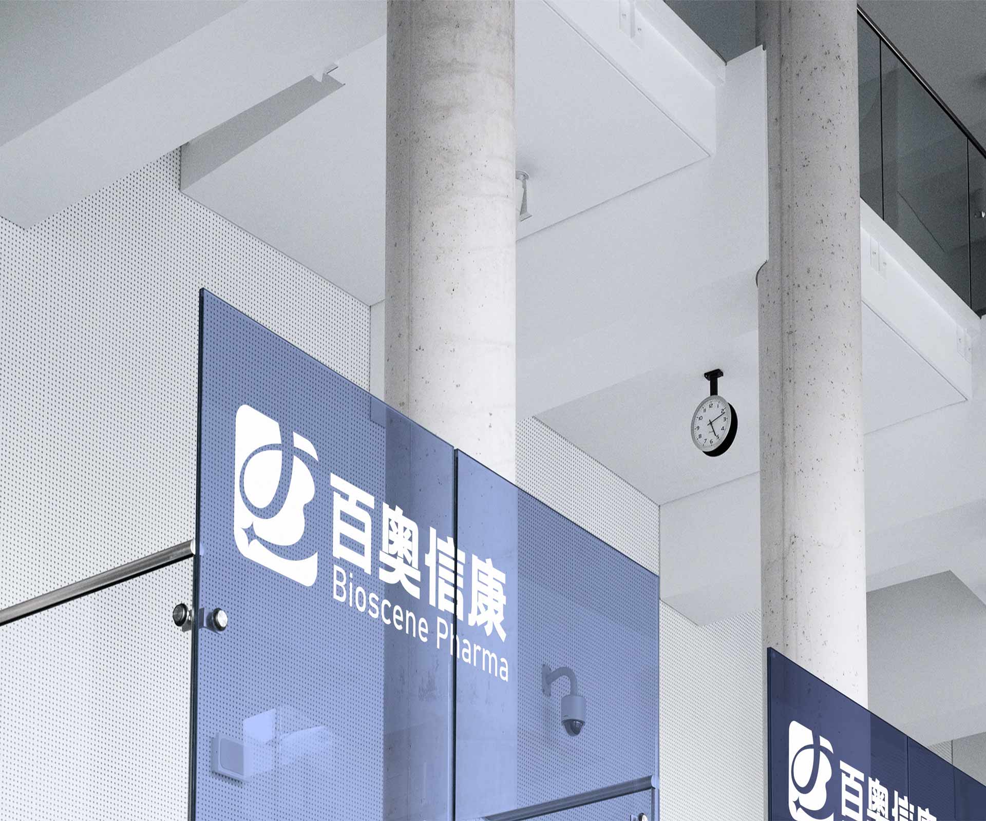 中英文品牌名稱“百奧信康”與“Bioscene Pharma”以專業(yè)字體搭配,清晰易讀,強(qiáng)化品牌識(shí)別。
