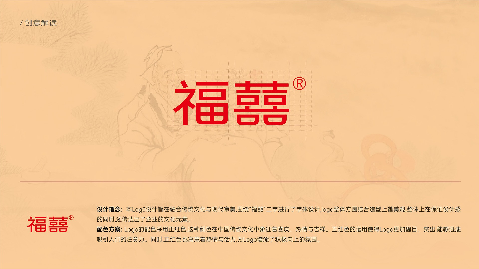 品牌標志(LOGO)設計:創作了兼具專業質感與親和力的品牌主標志。設計巧妙融合健康、科技與福祉理念,圖形簡潔現代,色彩穩重而不失活力,充分體現了福囍醫藥的企業特質與行業屬性。